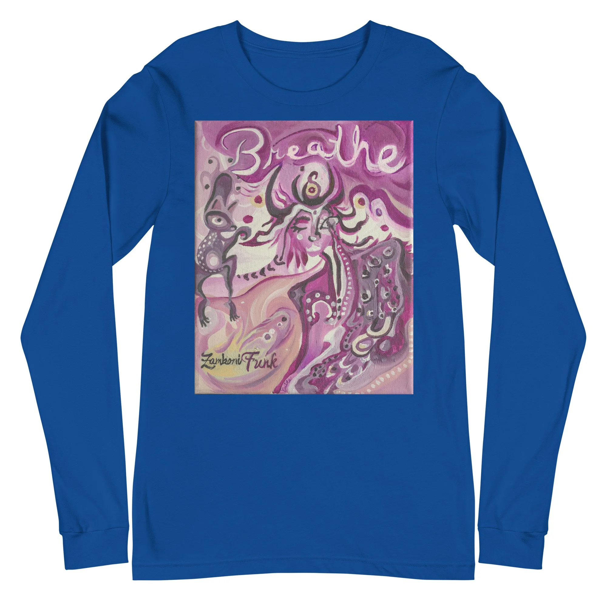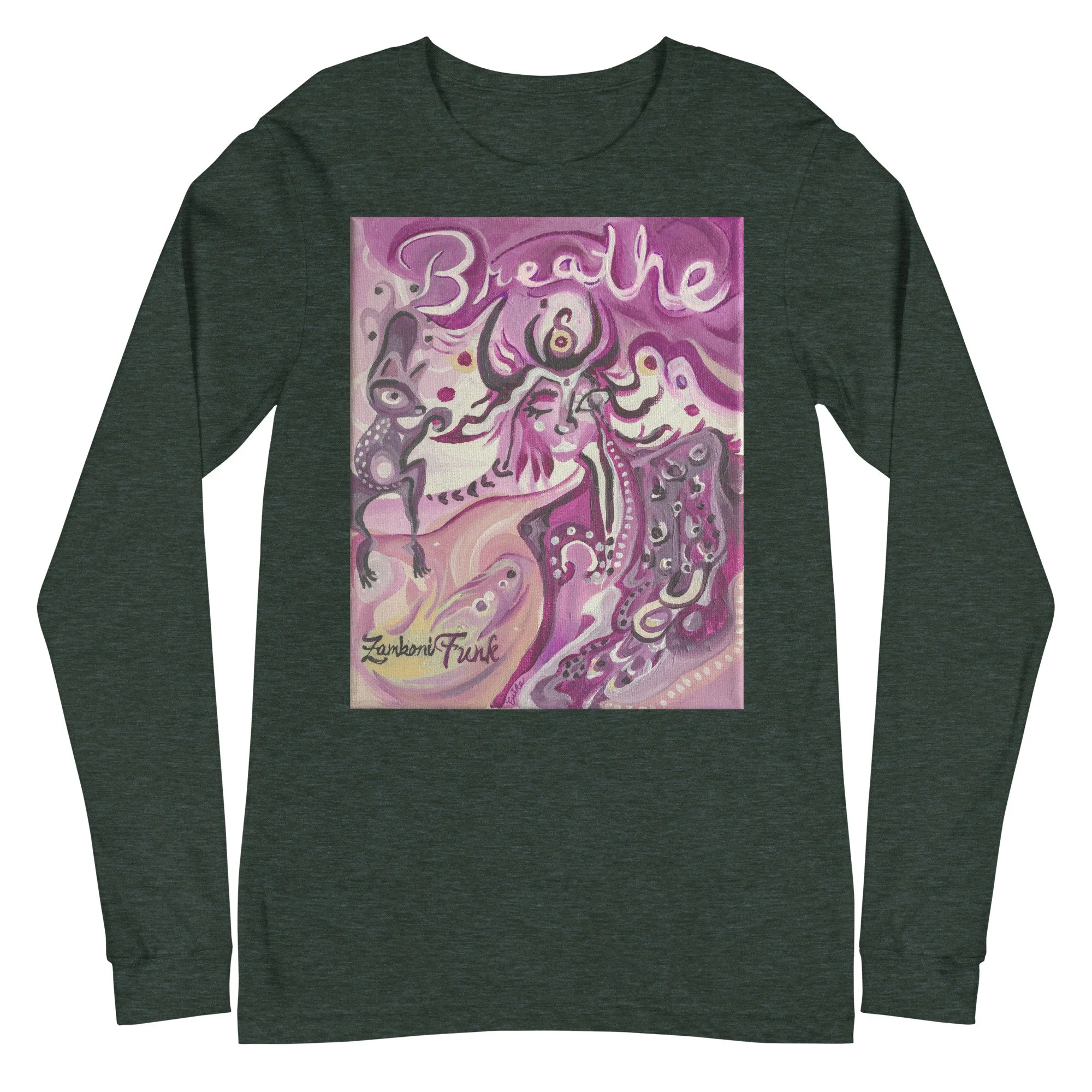 Inner stillness is made visible with the "Breathe" long-sleeve tee, featuring Erika Lopez / @oddminds' captivating psychedelic-abstract art. This tee invites mindfulness with its swirling magenta hues and the form of a mystic goddess, embodying the life-force of breath and spirit. It's a wearable mantra, connecting you to profound artistic vision and a meditative journey, perfect for cultivating peace amidst chaos.