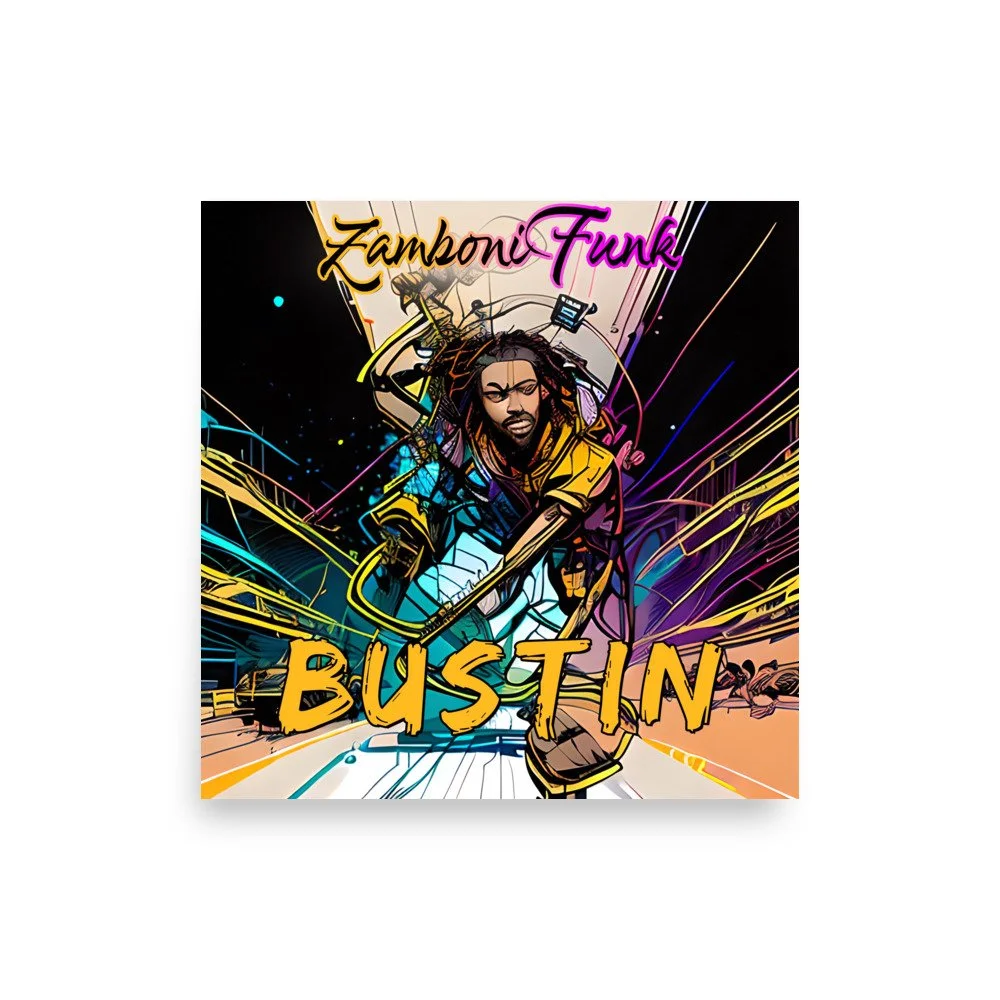 Original illustration by ZamboniFunk is a bold leap into the future, carried by an electrifying charge to drive the moment forward. Created for ZamboniFunk’s “Bustin,” the artwork channels the album's explosive momentum into a stylish fit.